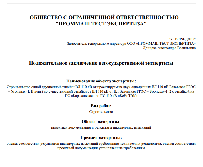 Наша компания получила положительное заключение экспертизы по объекту "Строительство одной двухцепной отпайки ВЛ 110 кВ от проектируемых двух одноцепных ВЛ 110 кВ Беловская ГРЭС – Угольная (I, II цепь)".