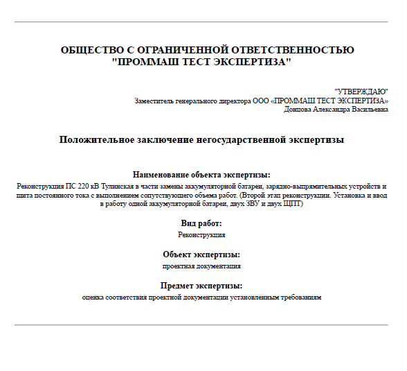 Получено положительное заключение экспертизы по титулу "Реконструкция ПС 220 кВ Тулинская в части замены аккумуляторной батареи, зарядно-выпрямительных устройств и щита постоянного тока с выполнением сопутствующего объема работ".